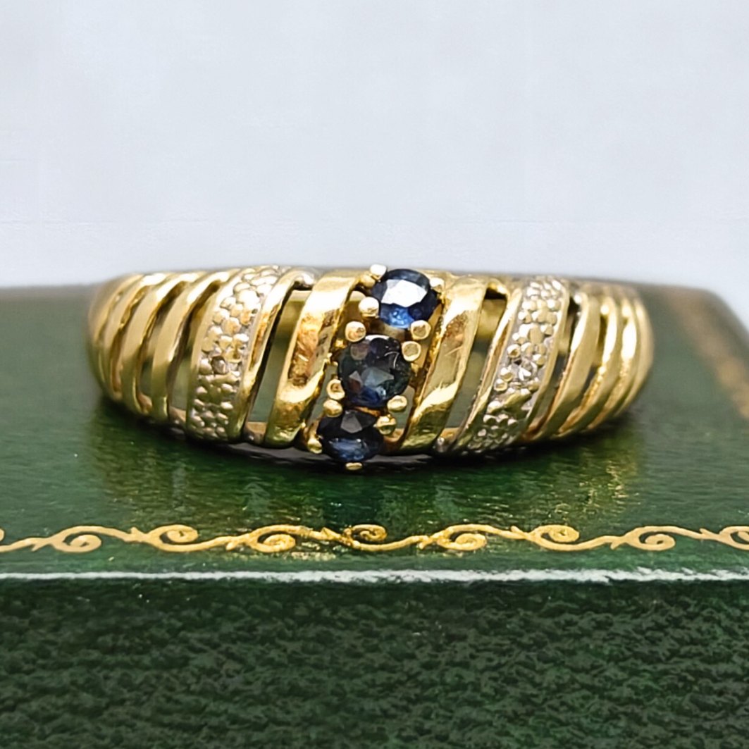 Ring i 14 kt. guld prydet med safirer og diamanter, der er fattet i hvidguld. Ring str. 55 Stemplet "585" Kontakt os gerne, hvis du søger noget specifikt. Hvad du ser på vores hjemmeside, er blot et udvalg af det, som vi har.