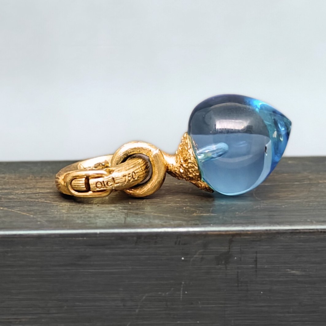 Ole Lynggaard; Sweet drop charm til at sætte på armbånd eller halskæder. i 18 kt. guld, med blå topas. Kan åbnes i øsknet, så den også kan sættes på en perle- eller stenkæde.