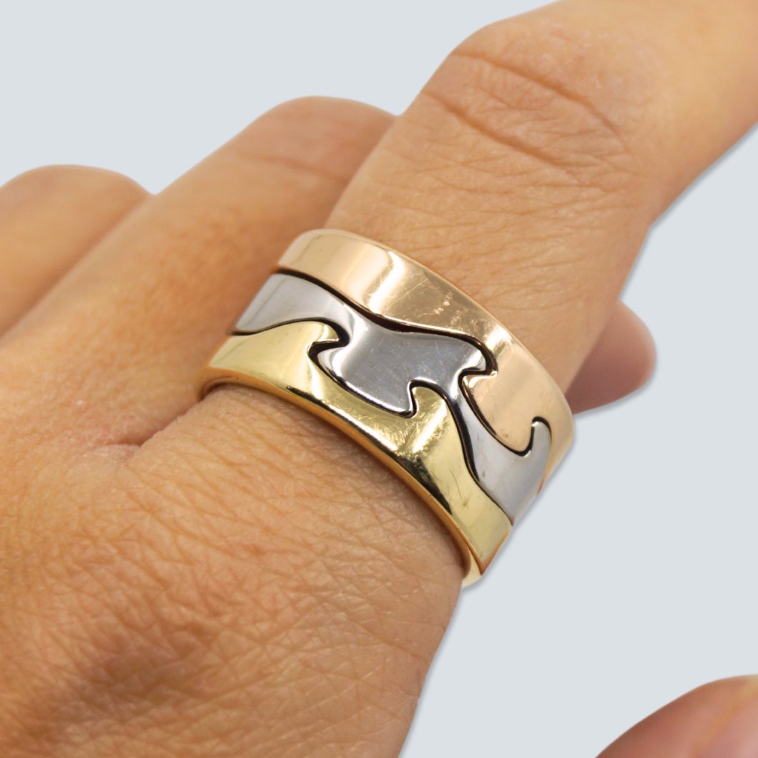 Nina Koppel for Georg Jensen; Three-piece fusion ring of 18k gold, white gold and rose gold. Ring size 58. Width: 1.2 cm.