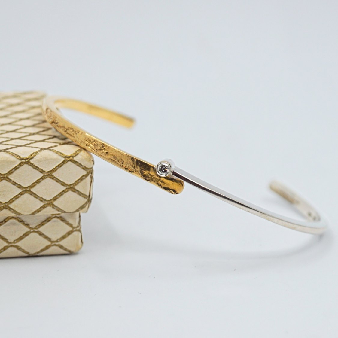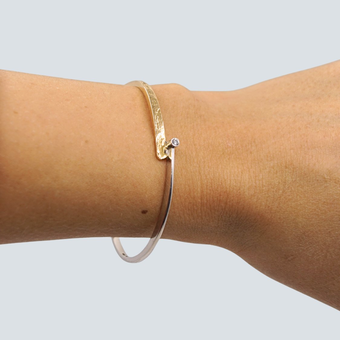 Guldarmring i 14 kt. hvidguld og guld, prydet med diamant i midten. Indvendige mål 5,6 cm x 5 cm. Designet med både glat og materet overflade i guldet.