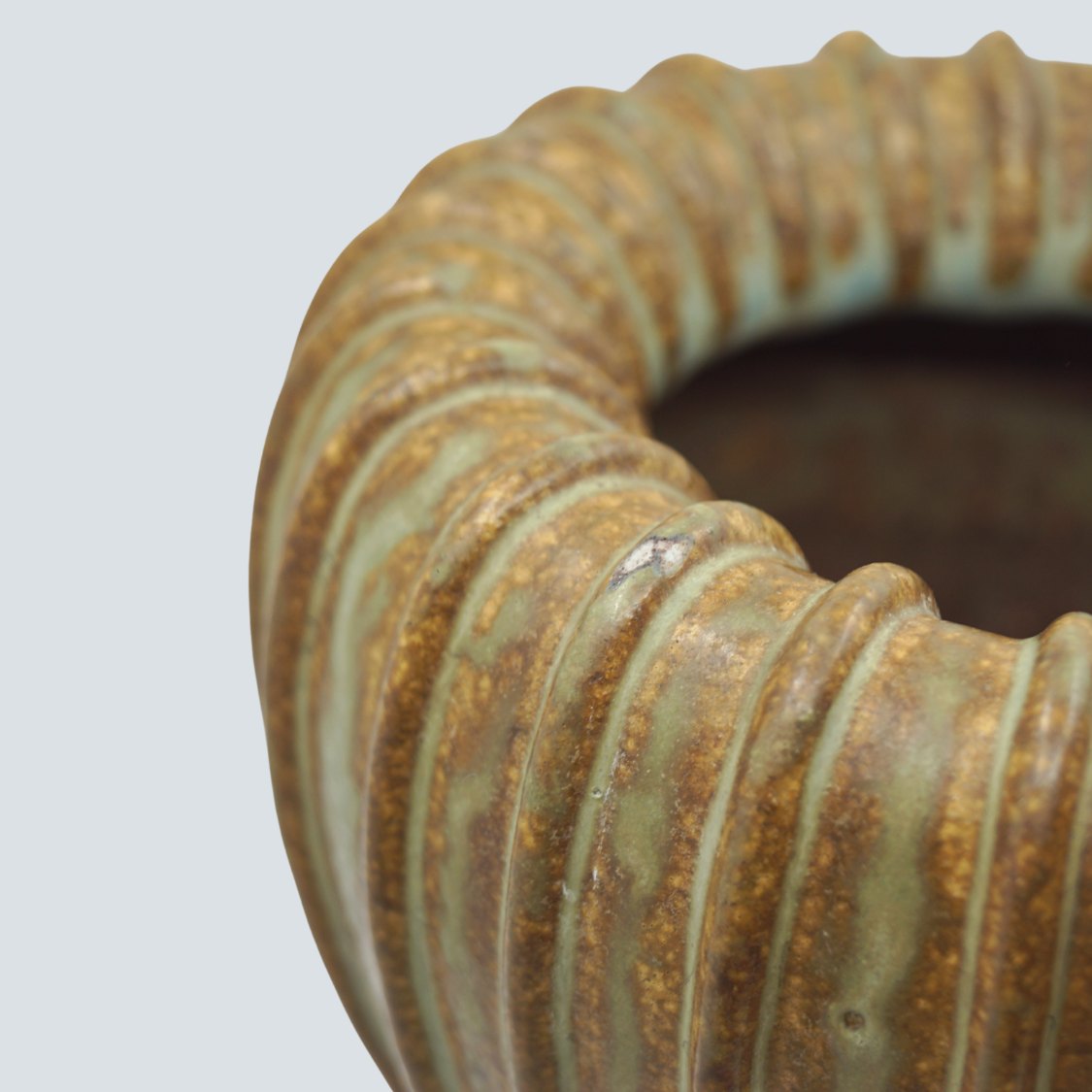 Arne Bang; Riflet vase af stentøj, nr. 139 Dekoreret med grønblå og brun glasur.