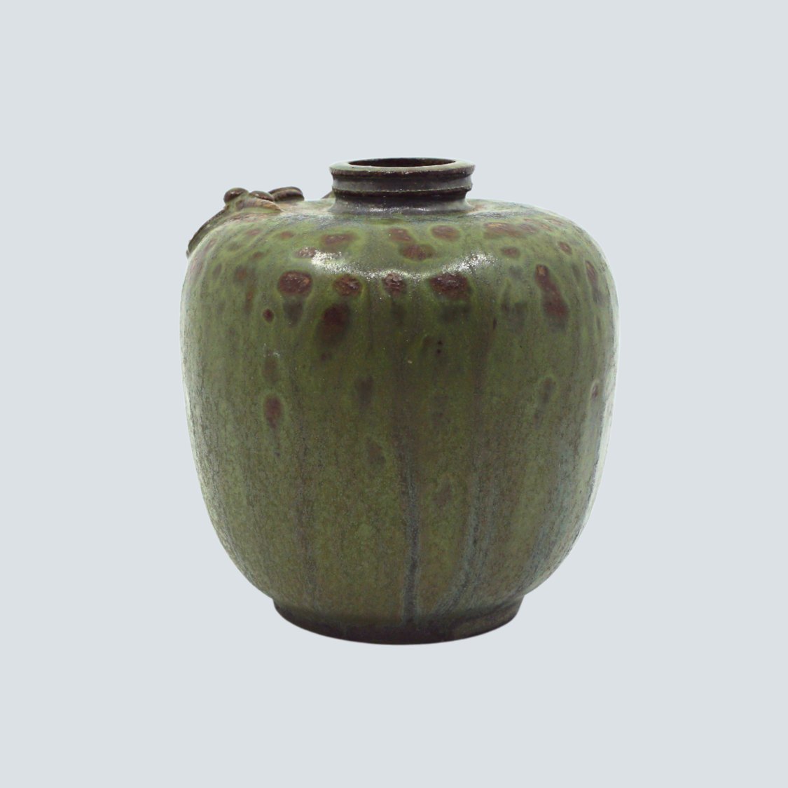 Arne Bang; Small stoneware vase, decorated with a flower branch. In green and brownish glaze. In good condition.